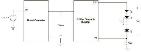 根據(jù)具體的設(shè)計,上述問題的影響可能可以忽略。但是,如果系統(tǒng)設(shè)計師對上述影響存有顧慮,可以采用單個串聯(lián)燈組作為首選拓撲結(jié)構(gòu)。在這種解決方法中,仍可以使用LM3406等部件,但將增大系統(tǒng)復(fù)雜性,因為需要新前端部件用于傳輸超出12V~14V的電源電壓為LED驅(qū)動器供電。然后,LED驅(qū)動器降低此新電壓,為單個LED燈組供電。這可以通過在直流電源和LM3406之間增加升壓DC/DC功率級輕松實現(xiàn),如圖10所示。通過此拓撲結(jié)構(gòu),串聯(lián)燈組中的所有LED均具有相同的電流,無論各LED的VF值是多少。