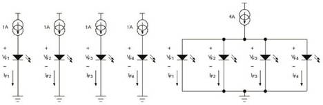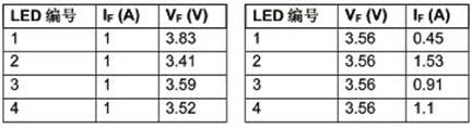 下例顯示了VF變化的影響。在實驗中,使用圖9所示兩種設(shè)置收集數(shù)據(jù)。一種設(shè)置用于4個LED,另一種設(shè)置用于并聯(lián)的4個LED。表1所示數(shù)據(jù)在25℃加電后5秒內(nèi)測得,以最大限度降低LED自發(fā)熱的影響、