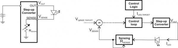 將閃光燈LED 與一個電流檢測電阻串聯,然后通過一個升壓轉換器來驅動,這是一種簡單的方法。圖1 描述了這種方法。