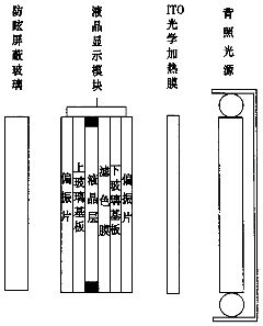將ITO 膜加熱玻璃放置在液晶屏前面(見圖1) ,通過對ITO 膜加電發熱,從而加熱液晶屏及其背光源。這種加熱方式的加熱速度、效率都比較低,對顯示器的低溫啟動時間存在一定的制約,因為加熱玻璃的功率不能制得太大,若功率太大對液晶屏的溫度沖擊有可能將其破壞。這種方法雖然存在一定的局限性,但由于其工藝簡單,易于實現,國內大部分廠家目前還是采用這種加熱方式。