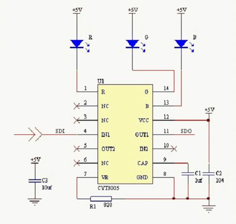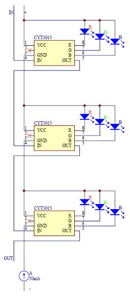 根據(jù)CYT3005單線傳輸驅動全彩LED燈設計圖,我們可以看出,單總線傳輸設計上顯得很簡單,這也是工程上最需要的傳輸方式。