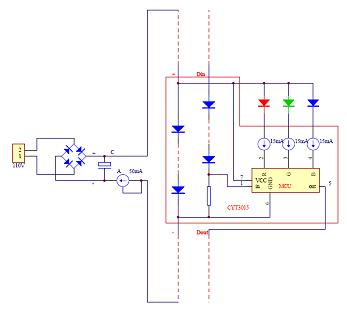 壓階傳輸,前面已經提到過了,它是一種高電壓低電流的傳輸方式,數(shù)據(jù)和供電都是工作在一個個臺階(壓階)上。那么怎么樣才能將LED全彩驅動IC從低壓大電流的方式轉換到高壓低電流的壓階傳輸方式?我們就在CYT3005單總線傳輸?shù)幕A上,進行壓階傳輸設計,如圖二所示。