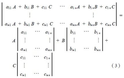 矩陣(2) 中的每一元素代表著M ×N 點CRT圖像中對應像素點的圖像亮度信息,而元素在矩陣中的位置恰恰是該像素點在CRT 圖像中的位置。其中A 、B 、C 代表著具有單位亮度的R、G、B 三原色,系數aij 、bij 、cij 為零和正整數,它決定著混成該像素點顏色所需R、G、B 三色的亮度份額,如果將該圖像白電平亮度所含R、G、B 三原色的亮度分別等分成N 級,那么每份亮度就是A 、B 、C , 即單位亮度, aij 、bij 、cij 的取值分別為從0 到N ,表示用aij 份的單元亮度紅色, bij 份的單位亮度綠色和cij 份的單位亮度藍色,可混成該元素所對應像素點的顏色。根據矩陣運算法則,矩陣(2) 又可表示為