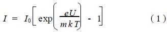 式中m 為復合因子, I0為反向飽和電流, UT =kT/e 稱為溫度電壓當量,在熱力學溫度T = 300 K時,UT = 26 mV1 在寬禁帶半導體中, 當I <0. 1 mA時,通過結內深能級進行復合的空間復合電流起支配作用,這時m = 2 ;電流增大后擴散電流占優勢時m = 1.U 為外加電壓。