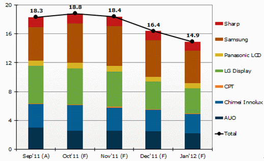 圖一、Sep’11-Jan’12各面板廠商液晶電視面板出貨計劃(單位:百萬片)