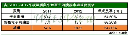 整體而言, WitsView 認為 2012年平板電腦的發展基調將偏向樂觀,預估平板電腦本身的需求達8,260萬臺,彩色電子閱讀器方面則為1,230萬臺,兩者合計的市場規模將從今年的5,760萬臺攀升至9,490萬臺,年成長率高達65%。