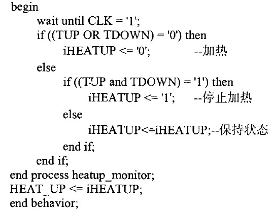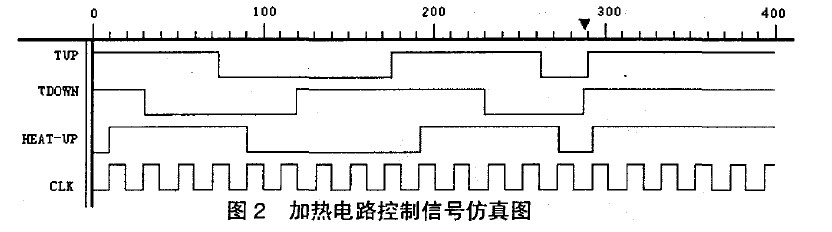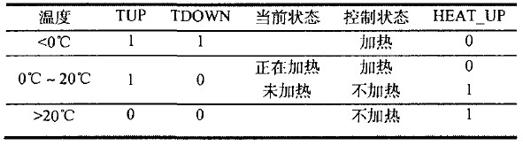 當環境溫度低于0℃ ,此時TUP與TDOWN均為高電平,FPGA/CPLD輸出高電平HEAT_UP,加熱電路工作。當環境溫度介于0℃與20℃之間時,如果此時正在加熱,則繼續加熱,如果當前未加熱,則無需加熱。當環境溫度高于20℃時,則停止加熱。
