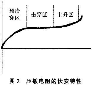 當(dāng)電路中出現(xiàn)雷電感應(yīng)過電壓或瞬態(tài)操作過電壓Vs 時(shí), 保護(hù)電路和被保護(hù)的設(shè)備(或者線路中的元器件) 同時(shí)承受了過電壓Vs ,由于壓敏電阻(保護(hù)電路的核心元件) 的響應(yīng)速度快,他以納秒級的時(shí)間迅速呈現(xiàn)優(yōu)良的非線性導(dǎo)電特性(圖2 中的擊穿區(qū)) ,使壓敏電阻其兩端的電壓迅速下降,遠(yuǎn)遠(yuǎn)低于Vs 值,有效地將過電壓限制在被保護(hù)設(shè)備或被保護(hù)元器件的絕緣耐壓值等級下,從而使電子鎮(zhèn)流器免受過電壓的傷害。保證了電子鎮(zhèn)流器不因電源中瞬時(shí)過電壓而影響其性能或受傷害。