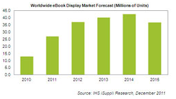 IHS iSuppli指出,2011年電子書閱讀器顯示器出貨量將自2010年的一千三百萬片,增長至二千七百一十萬片,年增率高達108%;不過,2012年成長率預估將衰退至37%,出貨量約達三千七百一十萬片;至2015年更將出現首次出貨量衰退的情形。