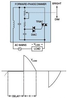 這種類型的調光能很好地用于白熾燈,因為它們是簡單的阻型負載。當導通角減小時,燈絲電阻上時間平均的電壓也下降,從而提供了自然平滑的調光。