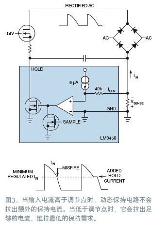 獲得效率最大化的最佳方式是調節最低輸入電流。采用這種方法時,當輸入電流高于調節點時,不會拉出額外的保持電流。當輸入電流低于調節點時,電路會拉出足夠的電流以維持最小的保持要求,LM3450控制器實現了這種方法,叫做動態保持(圖3)。它在二極管橋回返以及系統地之間有一只檢測電阻,提供了一種輸入電流的檢測方法。通過電阻上檢測到的電壓,控制器就可以線性地從保持管腳拉出電流,以維持最小的調節輸入電流。這樣就確保了額外功耗處于最小值狀態。