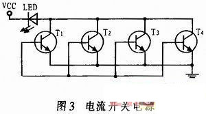 通過(guò)成形電路的信號(hào),控制大功率藍(lán)光LED發(fā)光,驅(qū)動(dòng)信號(hào)控制電流開(kāi)關(guān)。電流開(kāi)關(guān)選用一種大功率高頻三極管,為了滿足LED驅(qū)動(dòng)電流的需求,將4只三極管并聯(lián),使流過(guò)LED的脈沖電流最大達(dá)到2.5 A,保證了LED在額定功率下工作,達(dá)到穩(wěn)定光源的目的。在輸入驅(qū)動(dòng)信號(hào)的作用下,三極管進(jìn)入導(dǎo)通狀態(tài),LED兩端產(chǎn)生一定的壓降,大電流流過(guò)LED,使大功率藍(lán)光LED發(fā)光,作為距離選通水下成像系統(tǒng)的光源,電路如圖3所示。