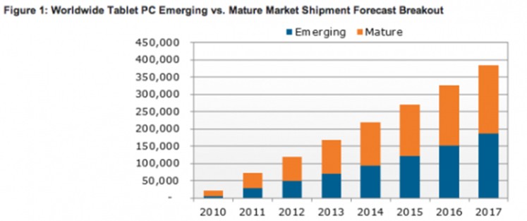 雖然那些數(shù)據(jù)本身就已十分驚人,但更令人關(guān)注的是,大多數(shù)新增的銷(xiāo)量將主要來(lái)自新興市場(chǎng)。預(yù)計(jì)到2017年,新興市場(chǎng)上平板電腦的銷(xiāo)量所占份額將由2011年的36%上升到到46%。