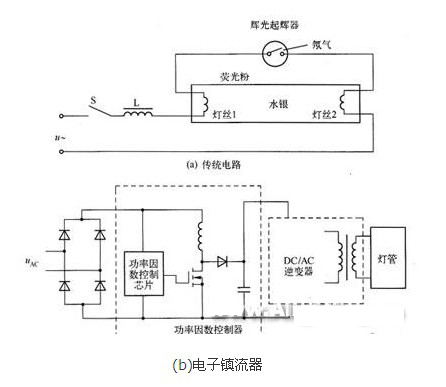 - 采用一個串聯的鐵芯電感和一個并聯的起輝器