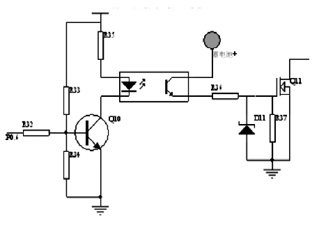 為了在夜間不同時刻采用不同的亮度,以達(dá)到節(jié)約電能的目的,本系統(tǒng)設(shè)計了兩路負(fù)載輸出,晚上12點以前兩盞LED皆亮,12點后一盞點亮,每路輸出均有立的控制和檢測。設(shè)計采用了PWM功率控制功能對LED燈具實現(xiàn)無級調(diào)光。單路原理如圖3所示。其中單片機P0.6 口給出控制信號, 即P 0 . 6 = 1 時, 三極管導(dǎo)通,繼電器閉合,MOS管導(dǎo)通,蓄電池向路燈供電。在電量不足或白天時,控制端輸出低電平信號,切斷供電回路。夜晚蓄電池電量不足情況下由市電供電系統(tǒng)給LED路燈供電,保證系統(tǒng)的完整和可靠。