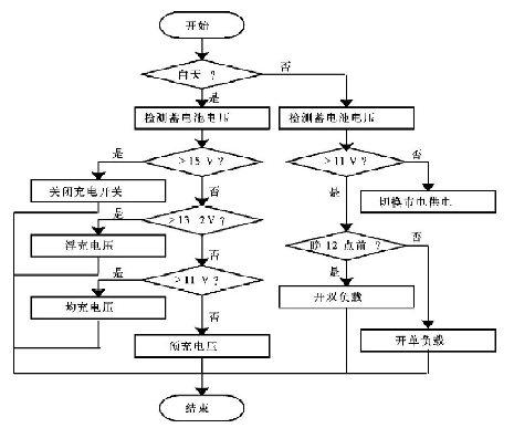 在放電過程中,首先保證在晚上12點前開通兩路負(fù)載,12點后開通一路負(fù)載,并且當(dāng)蓄電池電壓低于保護(hù)電壓(11V)時,控制器自動切換到市電供電系統(tǒng)或關(guān)閉負(fù)載開關(guān)以保護(hù)蓄電池不受損壞。因此,充電管理和放電管理是系統(tǒng)軟件設(shè)計中的主要內(nèi)容,充放電程序流程圖如圖4 所示: