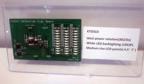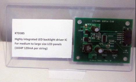 芯凱電子針對中大尺寸顯示屏應用領域的產品也是相當的豐富,他們中型尺寸顯示設備推出了全系列的電源管理解決方案及產品,通過這些優化的產品可以有效提高轉換效率,減少尺寸,并降低成本。同時,通過工藝和設計手段的不斷創新,針對LED TV和液晶顯示器的背光驅動推出了革命性的解決方案,KTD38X系列的產品就是他們將來重點推廣和生產的產品,據了解芯凱電子還會陸續推出38X系列更高性能能和高品質的應用于3D液晶顯示器的背光驅動產品。