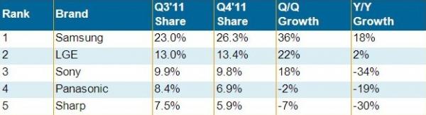2011年第四季度,三星全球平板電視營收占比提高到26.3%,為所有品牌歷史最高,且較第三季度提高了三個百分比。此外,在液晶電視和等離子電視方面,三星營收占比仍然遙遙領先,且等離子電視占比首次超過松下而居于首位;三星也是3D電視和LED電視市場的領先品牌。樂金電子為全球第二大品牌,占比為13.4%,且是除了三星以外唯一一個前五大品牌中在第四季度取得營收成長的品牌。索尼排名第三,營收占比為10%,但較去年同期下降了30%以上。