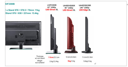 事實上,BMS模式對于品牌廠商而言并非完全出于成本考慮,而更側重于產品的差異化,以及品牌廠商將對渠道和消費者的理解體現在具體產品上,這對于提升品牌廠商終端產品競爭力而言至關重要。因此,我們可以發現,從2010年起,幾乎所有一線品牌廠商新增的系統組裝產品均為BMS模式。以下為TCL在BMS模式下生產的直下式的LED電視在基本外觀尺寸上與Samsung最新推出的直下式產品對比。從相關的指標來看,中國本土品牌在BMS一體化制造的能力已經取得了非常大的進步,甚至領先一步。