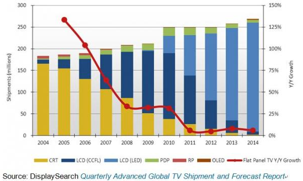 根據(jù)NPD DisplaySearch季度全球電視出貨和預測報告Quarterly Advanced Global TV Shipment and Forecast Report指出,全球電視出貨量連續(xù)兩年持平,2012年出口到西歐、日本等發(fā)達市場的電視總量預計將較去年下降11%,由此抵消了新興市場8%的年成長。盡管如此,隨著CRT和等離子電視逐步淡出市場,液晶電視將持續(xù)獲得更大市場份額。