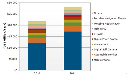 • 應用于手機的主動矩陣式顯示器的出貨量增加到2011年的15億臺