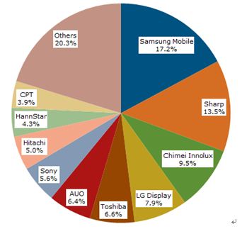 一如預期,三星移動顯示器(SMD)再次維持其領先的地位,在2011年市占率達到17.2%,主要來自于AMOLED在智能手機市場應用的提高。緊隨其后的是夏普和奇美, 2011年市占率分別為13.5%和9.5%。