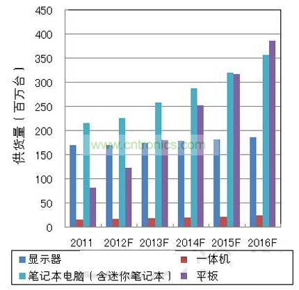 未來的市場動向方面,筆記本電腦市場的年增長率有望達(dá)到10~15%左右,平板電腦市場將憑借低價格和輕便、應(yīng)用程序與智能手機的通用性,繼續(xù)保持大約30~40%的增長率,到2016年,平板電腦的供貨量預(yù)計將超過筆記本電腦(圖1)。