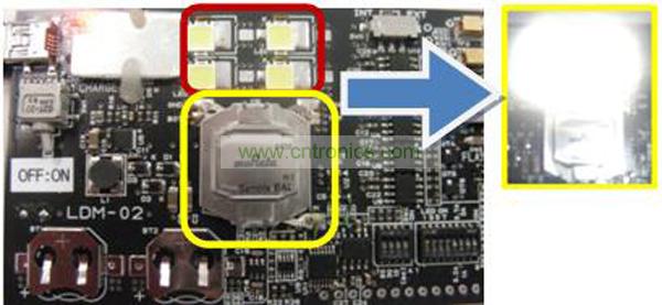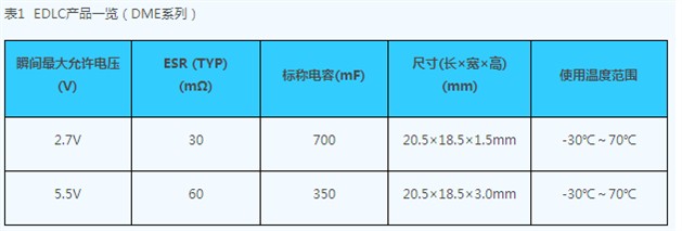 表1為村田制作所的EDLC產品一覽,圖4為使用了村田EDLC的LEDflach演示板。這個系統能在33毫秒內向LED提供最大為8A的大電流。(可控制在2A-8A/10-60毫秒)