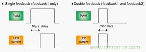圖4:有無與輸出不同的反饋電路的LED電流跟隨性比較