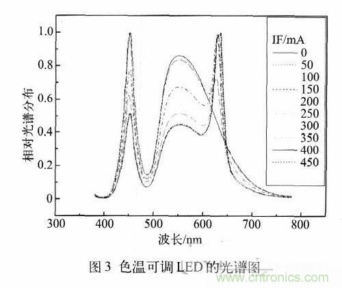 圖3為采用遠方HASS-2000高精度快速光譜輻射計測量得到的色溫可調LED的光譜圖,從圖中可以看出,隨著紅光LED電流的變化(從0到450mA),LED的相對光譜也會隨之變化,LED的光譜有三個峰值,分別在450nm、550nm和628nm,暖色溫的發光效率大于68lm/W,冷色溫的發光效率達到87lm/W。