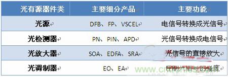 光通信器件包括光有源器件和光無源器件,有源無源按照是否需加外界能源驅動來區(qū)分。光有源器件主要負責光信號的產生、放大和接收,完成信號的光-電-光轉換和放大等功能。光有源器件包括光纖放大器、光纖激光器、光收發(fā)器和光調制器,這些器件都是光發(fā)射機、光接收機和光中繼器的關鍵器件,和光纖一起決定著基本光纖傳輸系統(tǒng)的水平。