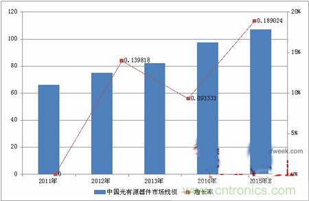 據OFweek行業(yè)研究中心出版的《2015-2018年中國光有源器件市場分析及前景預測報告》顯示,2011年-2014年中國光有源器件市場規(guī)模增長較快,年復合增長率達到14%。未來幾年會有所放緩,年復合增長率會降至10%左右。2014年中國光有源器件市場規(guī)模為97.5億元人民幣,估計2015年將達到107億元。
