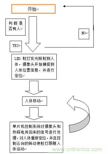 系統初始化之后,對狀態進行判斷,若沒檢測到人,則一直處于檢測狀態;若檢測到有人,則單片機控制IO口打開開關使得LED射燈發光照射到人體,攝像頭開始捕捉人體位置信息,并進行定位;當人體移動時,單片機控制系統對熱釋電和攝像頭傳回來的信號進行處理,對人體重新進行定位,并且控制云臺轉動使射燈跟隨人體運動;當人體再移動,便繼續“人體移動----數據處理---轉動云臺”這個循環過程。