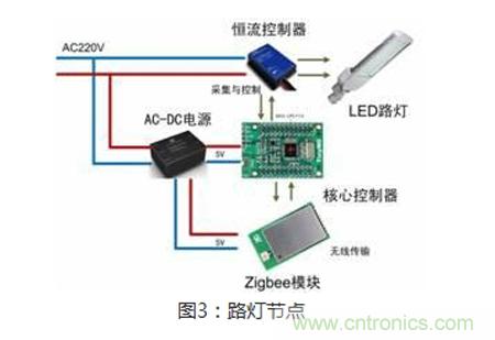 這是我們的一級終端,每個路燈節(jié)點由ZigBee無線模塊、核心控制板、光線及人流傳感器和LED燈組成。每個節(jié)點通過ZigBee接收命令,并實時匯報每盞路燈的亮、滅情況、實現(xiàn)亮度調(diào)節(jié)、傳送電能負荷狀態(tài)、完成燈桿損壞報警與漏電報警、接收來自ZigBee集中器的查詢命令、控制命令等。