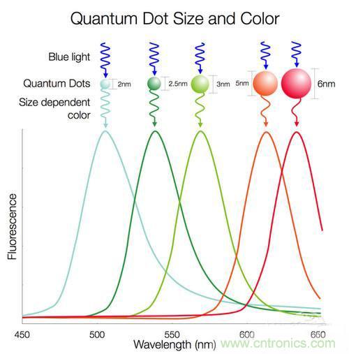 簡單通俗的說,量子點的光電性質(zhì)與以往的發(fā)光顯示顆粒大不一樣,量子點因為顆粒非常小,以納米為單位,導致量子點的顯示顏色是以改變顆粒的大小形狀而進行改變,也正因為如此,理論上來講,量子點顯示的色譜更具有連續(xù)性,成本也會更低。