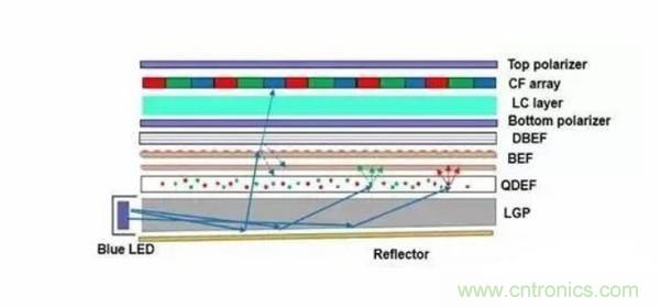 與此同時,QDEF層連擺放位置很計較,為了讓光在層層光學膜中旅行時,重復反射通過QDEF的次數(shù)增多,所以QDEF還得放在離光源最近的地方,一但順序往上移,紅綠光的轉(zhuǎn)換不足,就會造成偏藍的現(xiàn)象。