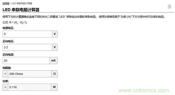 為了簡化計算,Digi-Key提供了一個LED串聯(lián)電阻計算器,幫您計算電路設(shè)計中所需要電阻的阻值和功率。