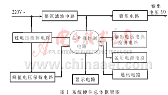 系統(tǒng)硬件框架如圖1所示。在正常的情況下,220V的交流輸入電壓經(jīng)過(guò)整流、濾波、DC/DC變換、穩(wěn)壓電路后可得到一個(gè)穩(wěn)定的輸出電壓,基本上是一個(gè)開(kāi)關(guān)電源;當(dāng)有過(guò)電壓時(shí),過(guò)電壓信號(hào)經(jīng)過(guò)過(guò)電壓檢測(cè)電路檢測(cè)和峰值電壓保持電路保持,控制電源回路,斷開(kāi)正常工作的交流電路,同時(shí)通過(guò)計(jì)算機(jī)啟動(dòng)備用電源工作,以及完成對(duì)過(guò)電壓的瞬時(shí)值和峰值的測(cè)量。