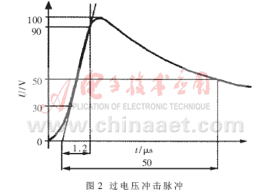 過(guò)電壓對(duì)于電源來(lái)說(shuō)是一個(gè)非常有害的信號(hào),雷電等引起的瞬時(shí)高電壓如果不加遏制,直接由電源引入RTU(遠(yuǎn)程終端設(shè)備)則會(huì)影響其電源模塊的正常工作,使各功能模塊的工作電壓升高而工作不正常,嚴(yán)重時(shí)會(huì)損壞模塊,燒壞元器件(IC)。典型過(guò)電壓形成的沖擊電壓脈沖如圖2所示。