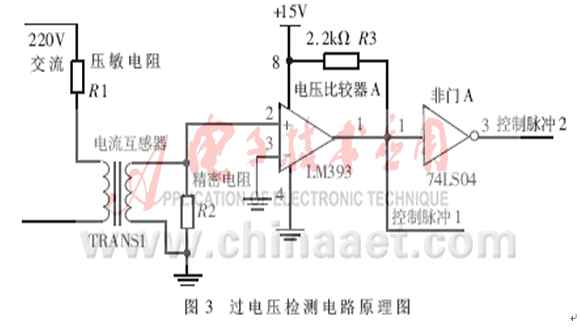 過(guò)電壓檢測(cè)電路原理圖如圖3所示。當(dāng)有過(guò)電壓信號(hào)產(chǎn)生時(shí),壓敏電阻被擊穿,呈現(xiàn)低阻值甚至接近短路狀態(tài),這樣在電流互感器的原級(jí)產(chǎn)生一個(gè)大電流,通過(guò)線圈互感作用在副級(jí)產(chǎn)生一個(gè)小電流,再通過(guò)精密電阻把電流信號(hào)轉(zhuǎn)變?yōu)殡妷盒盘?hào);這個(gè)信號(hào)輸入到電壓比較器LM393后,電壓比較器LM393輸出高電平,經(jīng)過(guò)非門(mén)A輸出的控制脈沖1控制電源回路,斷開(kāi)開(kāi)關(guān)電源電路,啟動(dòng)備用電源。控制脈沖2 送到單片機(jī)的中斷口,單片機(jī)控制回路啟動(dòng)A/D轉(zhuǎn)換,采樣過(guò)電壓的瞬時(shí)值。