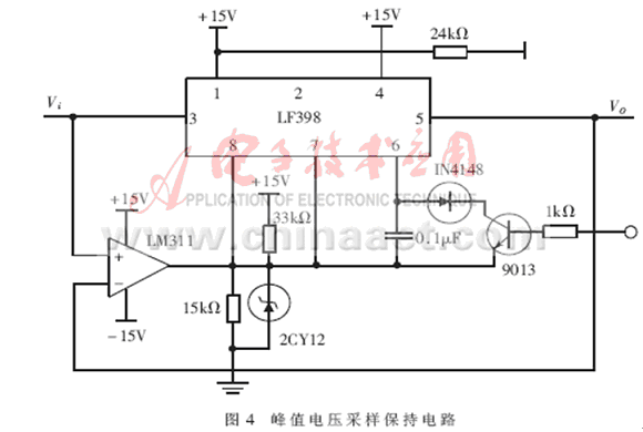 峰值電壓采樣保持電路如圖4所示。峰值電壓采樣保持電路由一片采樣保持器芯片LF398和一塊電壓比較器LM311構(gòu)成。LF398的輸出電壓和輸入電壓通過(guò)LM311進(jìn)行比較,當(dāng)Vi>V0時(shí),LM311輸出高電平,送到LF398的邏輯控制端8腳,使LF398處于采樣狀態(tài);當(dāng)Vi達(dá)到峰值而下降時(shí),Vi<V0,電壓比較器LM311輸出低電平,LF398的邏輯控制端置低電平,使LF398處于保持狀態(tài)。由于LM311采用集電極開(kāi)路輸出,故需接上拉電阻。由過(guò)電壓檢測(cè)電路輸出端送來(lái)的脈沖控制電子開(kāi)關(guān)的導(dǎo)通,沒(méi)有過(guò)電壓時(shí)采樣電容放電,否則采樣電路一直跟蹤峰值的變化。