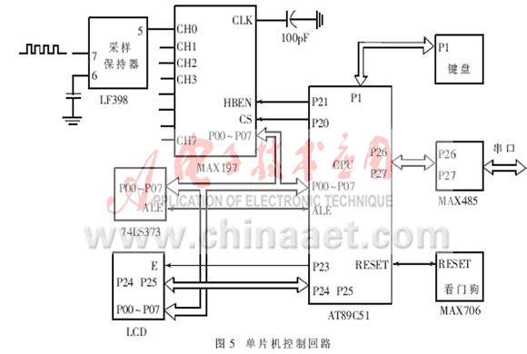 單片機(jī)控制回路如圖5所示。它的主要功能是完成對(duì)過(guò)電壓的瞬時(shí)值和峰值的檢測(cè)、過(guò)電壓次數(shù)的檢測(cè)、電源輸出電壓和電流的檢測(cè),并通過(guò)鍵盤(pán)的操作顯示出各個(gè)檢測(cè)值的大小;同時(shí)通過(guò)485接口和上位機(jī)實(shí)現(xiàn)通訊,在有過(guò)電壓的時(shí)候通過(guò)控制回路啟動(dòng)備用電源,實(shí)現(xiàn)對(duì)電源本身的保護(hù)。