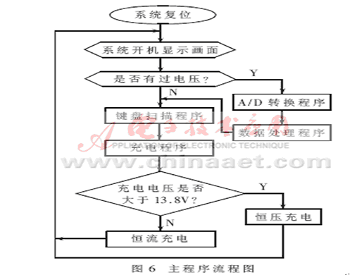 主程序由初始化、看門(mén)狗置位、鍵盤(pán)掃描子程序、中斷子程序組成。主程序主要進(jìn)行分配內(nèi)存單元、設(shè)置串行口等器件的工作方式和參數(shù),為系統(tǒng)正常工作創(chuàng)造條件。在主程序運(yùn)行的過(guò)程中,通過(guò)按鍵可以顯示檢測(cè)的各個(gè)量的值;同時(shí)在系統(tǒng)有過(guò)電壓和干擾信號(hào)產(chǎn)生時(shí),液晶顯示屏?xí)@示提示信息,使電源實(shí)現(xiàn)“透明”,便于電源的管理。在本系統(tǒng)中,鍵盤(pán)采用的是由P1口組成的3×3行列矩陣式鍵盤(pán)。由于鍵盤(pán)程序的技術(shù)已經(jīng)相當(dāng)成熟,所以具體過(guò)程不做介紹。
