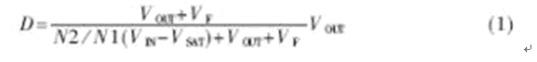 其基本工作原理為:當開關管Q1導通時(TON),電流流過變壓器T1的初級線圈N1,變壓器將能量以磁場的形式儲存起來,由于初、次級圈相位不同,所以當電流流過初級線圈時,次級線圈N2中沒有電流流過。當Q1截止時(TOFF),消失的磁場使初、次級線圈中電壓極性反轉,整流二極管VD導通,電流通過VD流向負載,變壓器的能量釋放,提供負載電壓、電流。控制器占空比為: