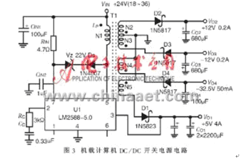 U1為控制器LM2588-5.0。脈沖變壓器T1共有五個繞組:N1為初級繞組,N2、N3、N4、N5為次級繞組,分別對應輸出+12V@0.2A、-12V@0.2A、-32.5V@0.05A以及+5V@4A,且N2、N3圈數相同。