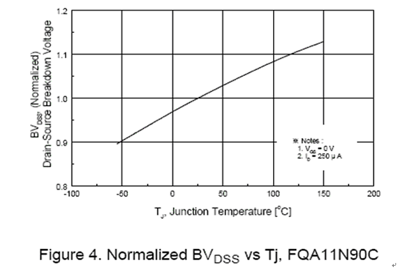 一般而言 假使 Drain 及 Source 電壓超過(guò)規(guī)格書(shū)所載明的最大額定電壓稍大一些 , 此時(shí)要讓場(chǎng)效應(yīng)晶體管產(chǎn)生崩潰現(xiàn)象其實(shí)是不常發(fā)生的。圖四所表示的曲線(xiàn)為場(chǎng)效應(yīng)晶體管的額定最大工作電壓 (BVDSS) vs 接合面溫度 (Tj), 其特性的表示是以正溫度特性變化 。當(dāng)接合面溫度達(dá)到 120 ° C 時(shí) , BVDSS 可達(dá)到將近 990V 。由此可知 , 在更高的接合面溫度條件下 , 場(chǎng)效應(yīng)晶體管需要更高的 Drain 對(duì) Source 的電壓以達(dá)到崩潰效應(yīng)產(chǎn)生的必要條件。