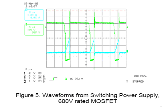 但這里必須提醒一件事 , 圖四所標(biāo)示的 BVDSS 是基于 250uA 的 ID 電流為條件所定義。在實(shí)際崩潰發(fā)生時(shí) ID 電流遠(yuǎn)大于 uA 的范圍。 因此 , 所欲達(dá)到的崩潰電壓也會(huì)比上述圖四中所推導(dǎo)的電壓要來(lái)的大的多。就實(shí)際的考量而言 , 場(chǎng)效應(yīng)晶體管的實(shí)際崩潰電壓一般是額定低電流崩潰電壓的 1.3 倍。以圖五為例 , 它所表示的是一個(gè)超過(guò)最大額定電壓但并未進(jìn)入崩潰現(xiàn)象的波形 ,Drain-Source 的電壓已達(dá)到 668V > 600V 但并未嵌制于崩潰效應(yīng)。