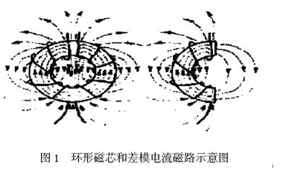 磁芯的作用就好像它在線圈繞組的間隙處裂為兩半時所表現出來的效果一樣。每個繞組在環形線圈一半的區域內產生磁場,意指穿過空氣的磁場必定會形成自封閉回路。圖1是環形磁芯和差模電流磁路的示意圖。