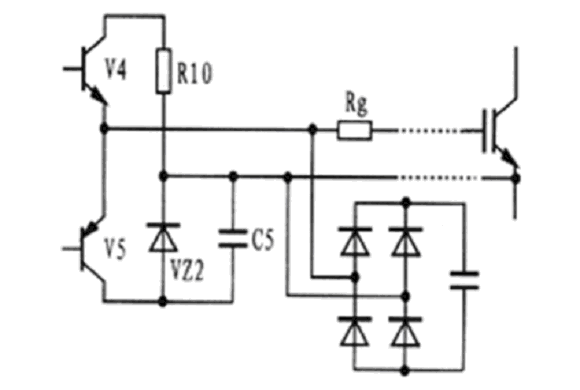 圖5所示為EXB841與IGBT柵-射極之間的連接電路原理圖。當驅動電路中的V4導通時,IGBT處于正常導通狀態(tài),當V5導通時,IGBT柵-射極之間通過穩(wěn)壓管VZ2提供一個-5V電壓加在其兩端,使IGBT關斷,此時V5處于臨界導通狀態(tài),穩(wěn)壓管VZ2處于反向偏置狀態(tài)。但由于集-柵極之間分布電容的影響,集-柵極之間的du/dt增大時,其通過分布電容形成的電流經過,所以,要克服集-柵極之間的du/dt,確保穩(wěn)壓管不過壓,避免IGBT誤導通。克服du/dt的方法有二種:一是驅動電路輸出與IGBT柵-射極之間的連線采用雙絞屏蔽電纜,屏蔽層接地,二是采用快速吸收電路吸收過電壓。