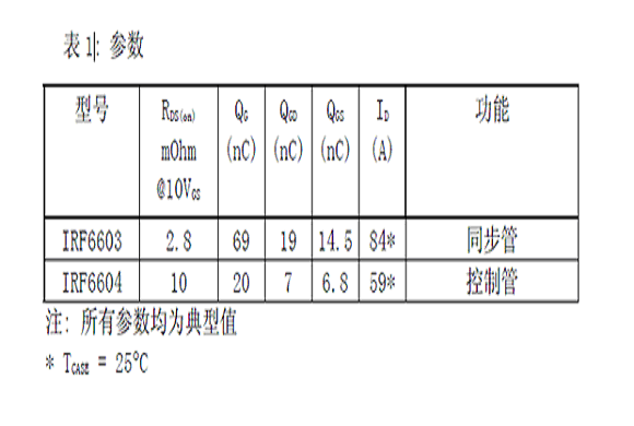 此設(shè)計(jì)可以高效輸出超過(guò)100A(>25A/相)的電流而面積只有95mm×31mm(3.8inch X 1.25inch )。每項(xiàng)均使用一個(gè)控制管和一個(gè)同步管的DirectFET MOSFET。用作控制管和同步管的30V DirectFET的規(guī)格見(jiàn)表1。請(qǐng)注意它們高的載流能力省去了器件并聯(lián)的需要。
